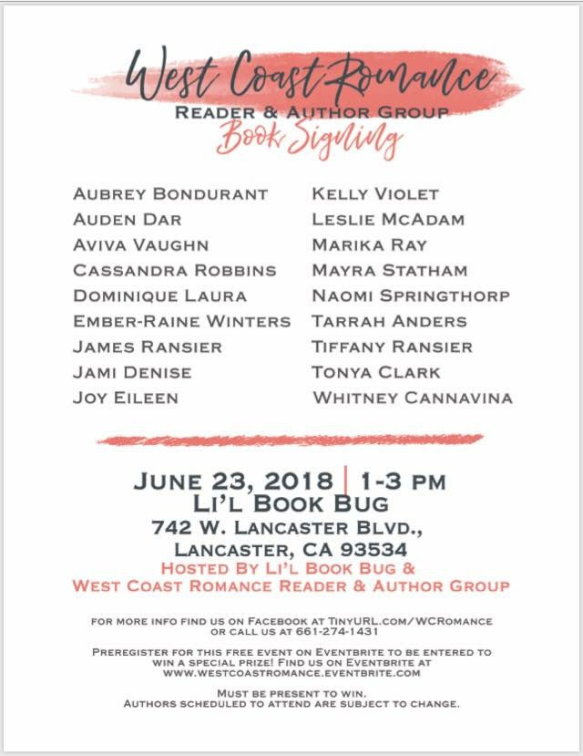Hey SoCal readers! There is a FREE author signing event! The West Coast Romance Reader & Author event It's FREE!! Where? Li’l book Bug 742 W. Lancaster Blvd. Lancaster, CA 93534 Time 1-3 pm There will a lot of giveaways! Preregistration is open, you could win a special giveaway! LINK TO PREREGISTER: http://www.westcoastromance.eventbrite.com/ LINK TO EVENT PAGE ON FACEBOOK: http://tinyurl.com/wcromance